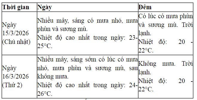 Khu vực Hà Nội: ngày 15-16/3/2026 đêm và sáng có khả năng có mưa nhỏ, mưa phùn và sương mù. Sáng và đêm trời lạnh.