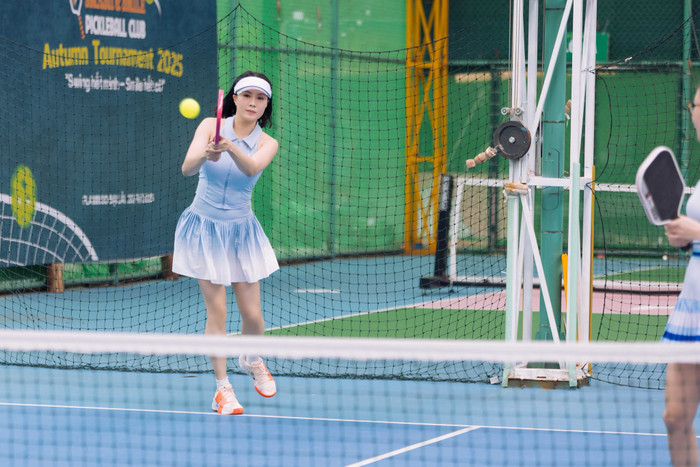 Bộ trang phục của Hồng Diễm thể hiện rõ xu hướng thời trang pickleball hiện nay khi kết hợp giữa tính ứng dụng thể thao cao và yếu tố thẩm mỹ nữ tính. Không chọn những set đồ quá bó sát hay crop top hở bụng phổ biến ở một số người chơi trẻ, Hồng Diễm ưu tiên váy dáng suông nhẹ, chất liệu thoáng khí, giúp dễ dàng thực hiện các động tác swing vợt, di chuyển nhanh mà vẫn duy trì sự thanh lịch.