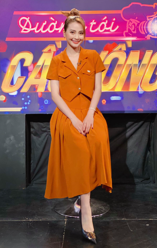 Những tông màu ấm như đỏ burgundy của chiếc váy thanh lịch hay bộ set cam đất đều được cô khai thác triệt để, không chỉ tôn lên làn da trắng sáng mà còn truyền tải nguồn năng lượng tích cực, rất phù hợp với tính cách hoạt bát của một MC.