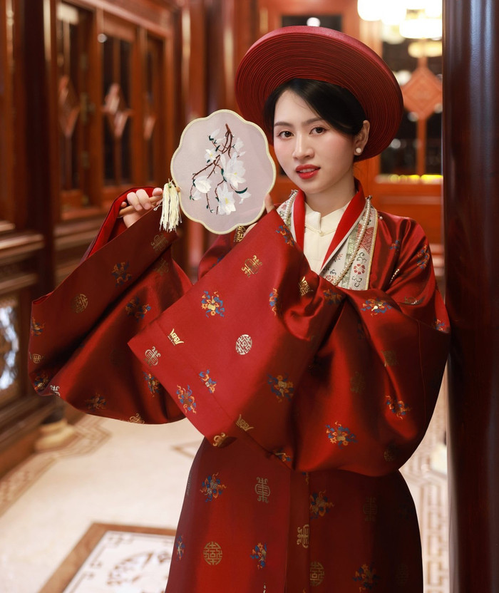Gần đây, con dâu bà chủ Thẩm mỹ viện Mailisa diện áo dài tứ thân đỏ thêu chỉ vàng, chất liệu lụa tơ tằm An Nam với họa tiết rồng phượng – biểu tượng may mắn trong văn hóa Việt. Nón lá đỏ nâu lá, quạt giấy hoa mai trắng và vòng cổ ngọc trai đen từ Tahiti, đường kính 8mm, được đánh bóng tự nhiên để giữ độ óng ả, tạo nên vẻ ngoài trang nghiêm. Ảnh: FBNV