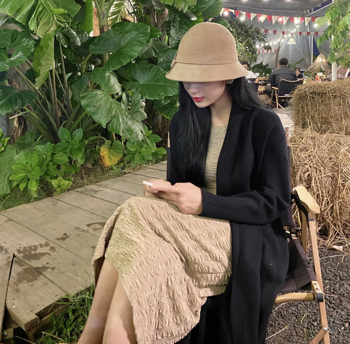 Khi đi chơi với gia đình, con dâu bà chủ Thẩm mỹ viện Mailisa ưu tiên sự giản dị với set đồ oversized, như áo khoác len đen dài tay từ len cashmere Úc, váy dài be nhạt và mũ bucket nâu da lộn. Ảnh: FBNV