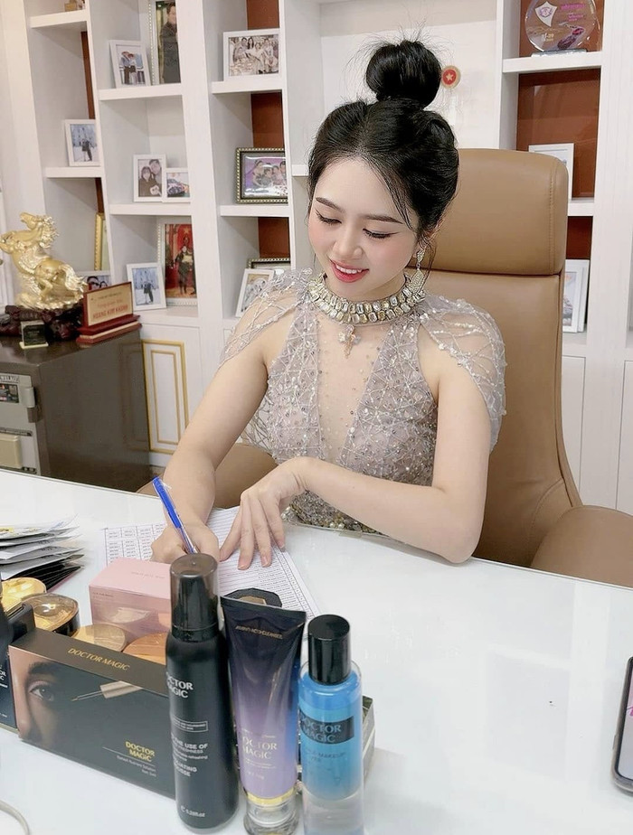 Con dâu bà chủ Thẩm mỹ viện Mailisa duy trì lối makeup tự nhiên với nền da mỏng nhẹ từ kem CC, eyeliner cánh mèo mảnh và son bóng hồng đào, kết hợp routine dưỡng da hàng ngày bao gồm serum hyaluronic acid và mặt nạ collagen để giữ làn da căng bóng, glowy. Ảnh: FBNV