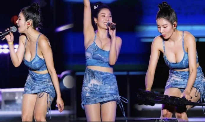 Đỉnh điểm là Waterbomb Seoul 2025, khi Eun Bi diện outfit mang phong cách cao bồi cực “cháy”: bikini trắng kết hợp sơ mi đỏ caro, quần short siêu ngắn và bốt cao. Bộ cánh gợi cảm đến nghẹt thở này không chỉ khiến khán giả reo hò mà còn phủ sóng khắp các trang tin trong và ngoài Hàn Quốc.