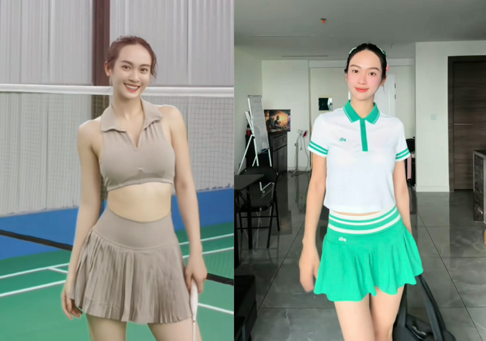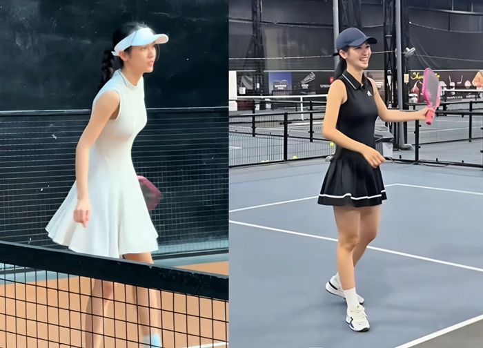 Ngoài quần short, Thúy Quỳnh còn chọn váy tennis kết hợp áo thun thể thao để tạo vẻ nữ tính nhưng vẫn linh hoạt khi chơi thể thao. Áo thun ôm nhẹ đi cùng váy xếp ly giúp cô tự tin di chuyển, đánh bóng mà không bị cản trở. Cách phối này vừa tiện dụng, vừa mang đến hình ảnh nhẹ nhàng, thanh thoát, phù hợp cho các buổi tập ngoài trời.