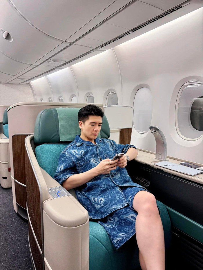 Thậm chí, khi chọn những họa tiết táo bạo hơn như set denim monogram trên máy bay hay họa tiết chim hạc trên nền đen, Đỗ Quang Vinh vẫn giữ được sự chỉn chu nhờ phom dáng rộng rãi, thoải mái, cho thấy sự ưu tiên về chức năng và cảm giác dễ chịu khi di chuyển. Ảnh: FBNV