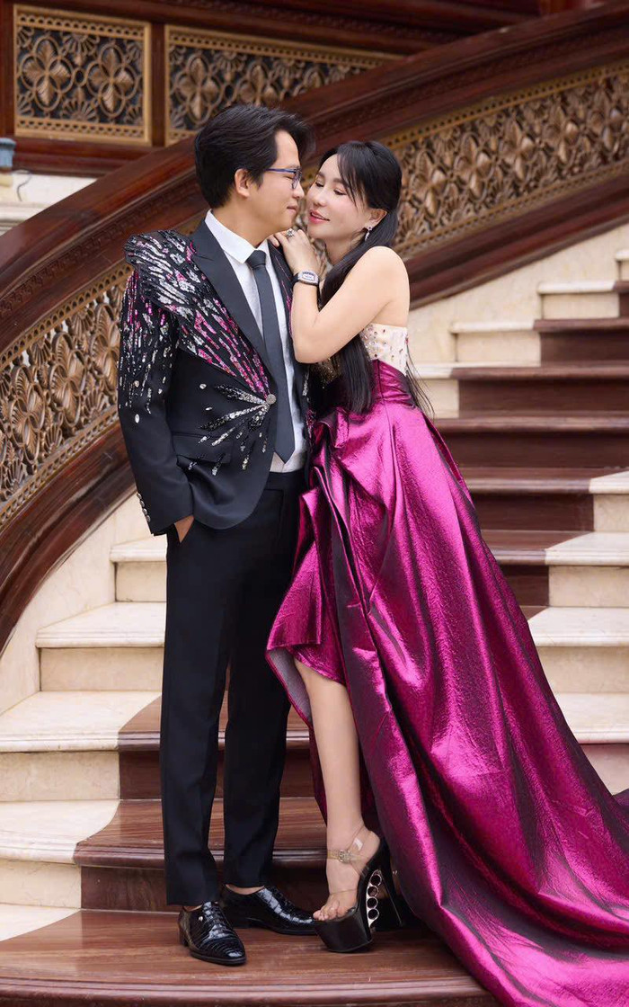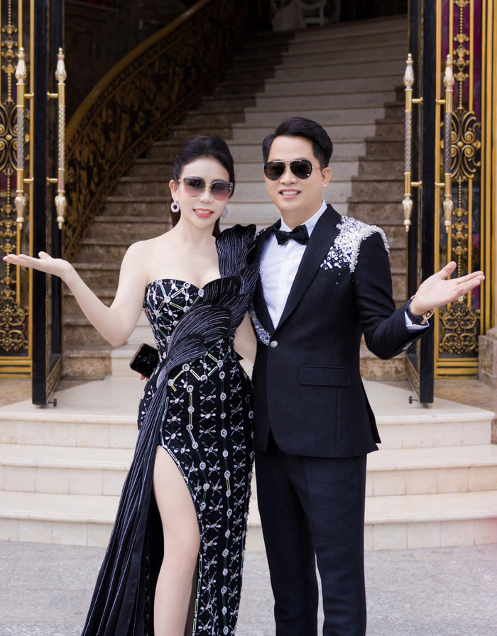 Nếu bà chủ thẩm mỹ viện Mailisa diện đầm dạ hội với các chi tiết đính kết lấp lánh hoặc lông vũ, ông xã Hoàng Kim Khánh sẽ chọn bộ suit đen hoặc xanh navy sắc nét, nhưng phần vai, ve áo hoặc tay áo sẽ được trang trí bằng các chi tiết thêu đính, kết cườm 3D hoặc họa tiết ánh kim tương ứng. Ảnh: FBNV