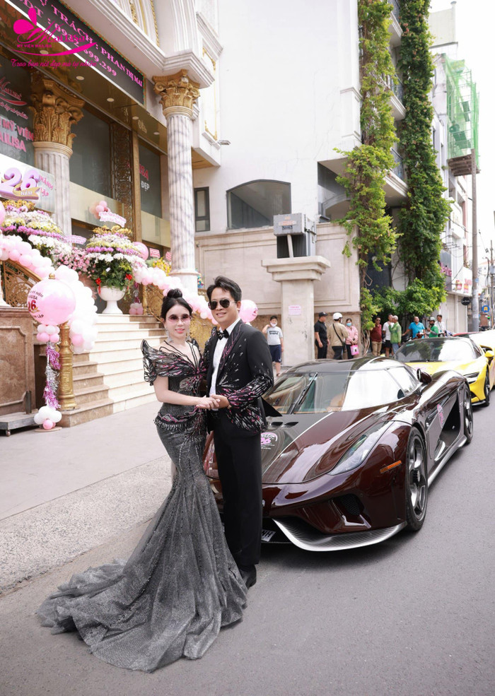 Trong những sự kiện lớn hay các lần xuất hiện bên cạnh dàn siêu xe đắt đỏ, phong cách dạ hội của vợ chồng bà chủ thẩm mỹ viện Mailisa luôn là tâm điểm nổi bật. Họ không chỉ gây ấn tượng bằng sự xa hoa, mà còn bởi khả năng xây dựng hình ảnh cặp đôi đầy khí chất thông qua thời trang đồng điệu. Ảnh: FBNV