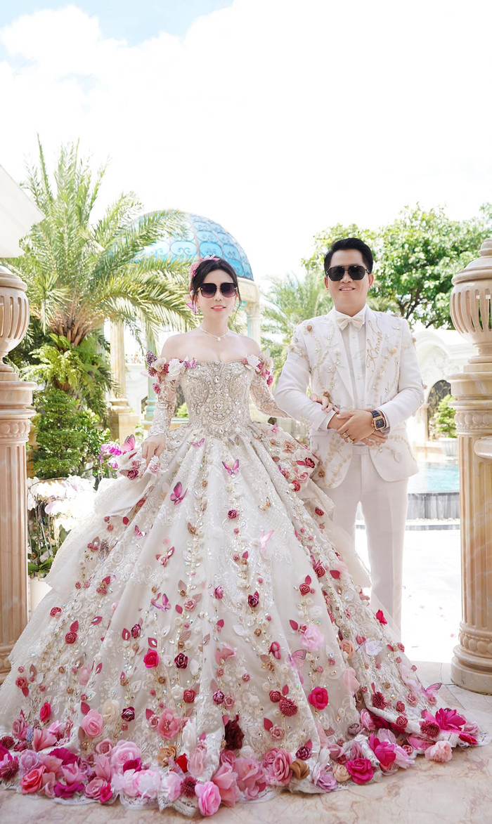 Trong những khoảnh khắc lãng mạn, trang phục của họ luôn được đầu tư công phu, thể hiện sự hòa hợp trọn vẹn. Cặp đôi lựa chọn sắc trắng tinh khôi và hồng ngọt ngào làm chủ đạo. Bà chủ Mailisa nổi bật với chiếc váy đính hàng ngàn bông hồng và bướm 3D tinh xảo, trong khi người chồng diện suit trắng lịch lãm, phối nơ bướm đồng màu và chi tiết thêu đính cầu kỳ, tạo nên sự đồng bộ sang trọng và đầy gắn kết. Ảnh: FBNV