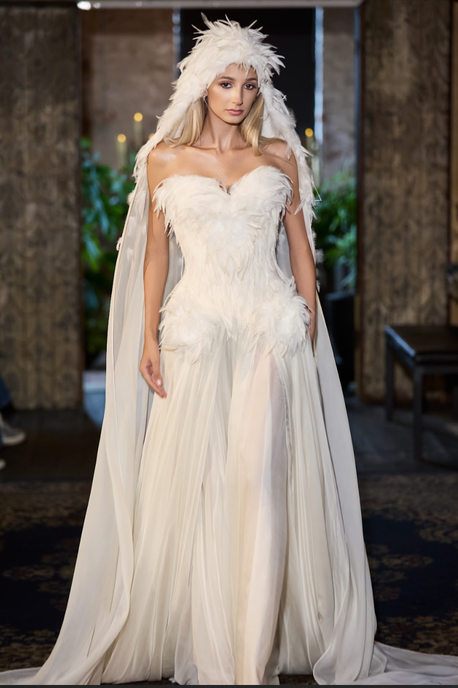 Thiết kế đầm WINGS OF HOPE được phủ đầy lông vũ tinh khôi – mềm mại, bay bổng, như biểu trưng cho khát vọng tự do và ý chí vươn xa mạnh mẽ.