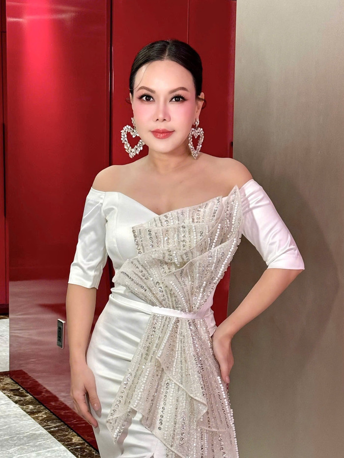 Ngoài ra, cách phối đồ của Việt Hương luôn nhấn mạnh sự cân bằng: không quá hở hang nhưng đủ gợi cảm, với các chi tiết như bèo nhún vai, nơ buộc eo hoặc sequin viền tay để thêm nét nữ tính. Ảnh: FBNV