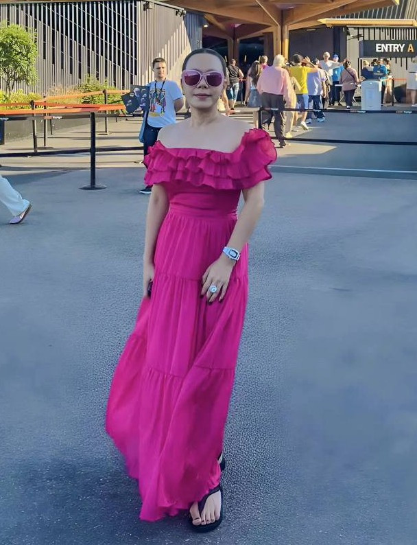 Việt Hương thường ưu tiên cách phối đồ tập trung vào váy off-shoulder để tôn tối đa phần vai thon và xương quai xanh. Cô ưa chuộng những chiếc váy chiết eo nhẹ nhàng, quyến rũ như váy maxi trễ vai dài chấm gối hoặc midi xếp ly làm lớp chính, kết hợp lớp bèo nhún hoặc voan mỏng ở phần vai để tạo độ bồng bềnh tự nhiên. Ảnh: FBNV