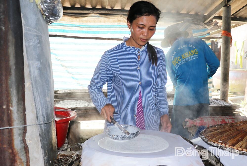 Tại cơ sở sản xuất bánh tráng của gia đình chị Nguyễn Thị Kim Yến (ấp Hậu Thuận), không khí lao động diễn ra khẩn trương.