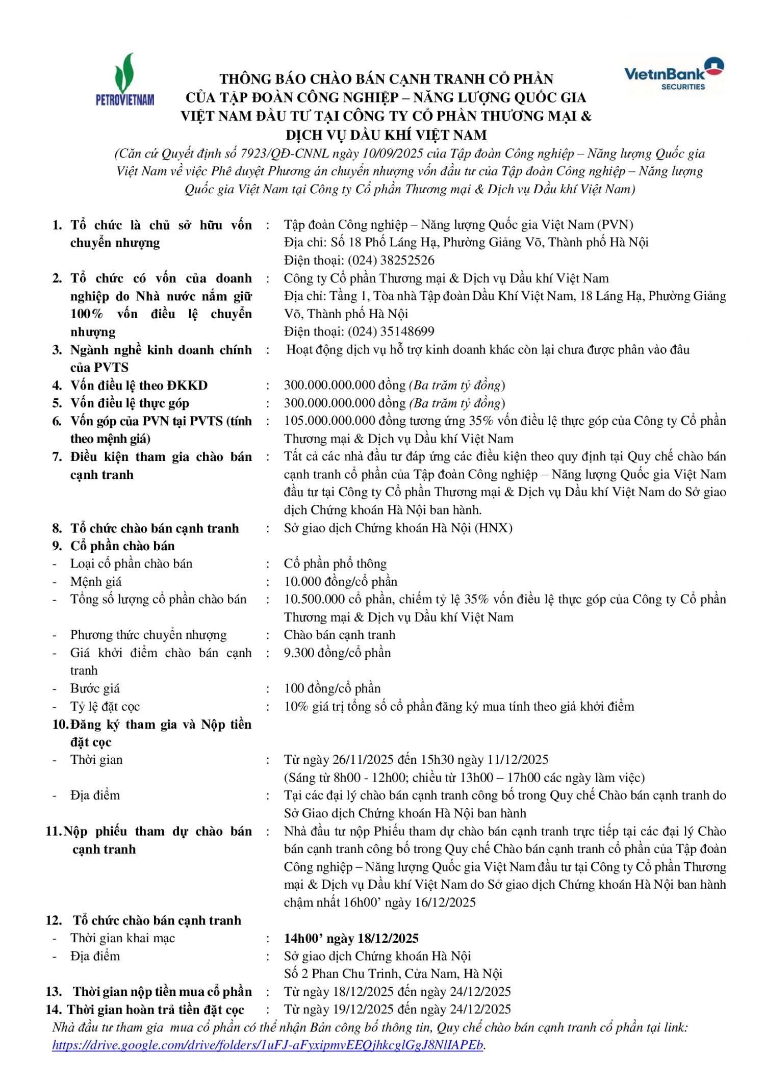 Nguồn PetroTimes : https://petrovietnam.petrotimes.vn/thong-bao-chao-ban-canh-tranh-co-phan-tai-cong-ty-co-phan-thuong-mai-dich-vu-dau-khi-viet-nam-735005.html