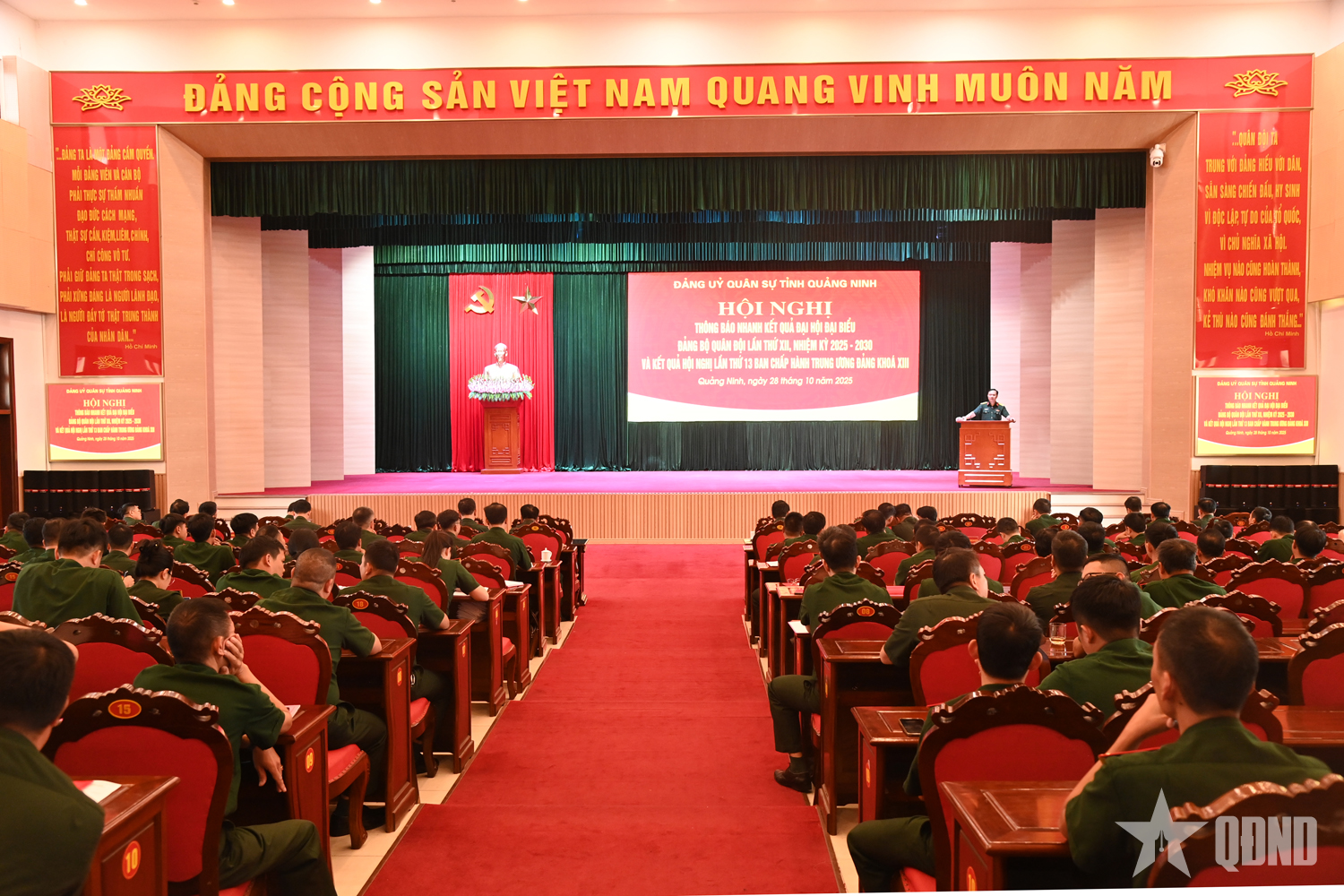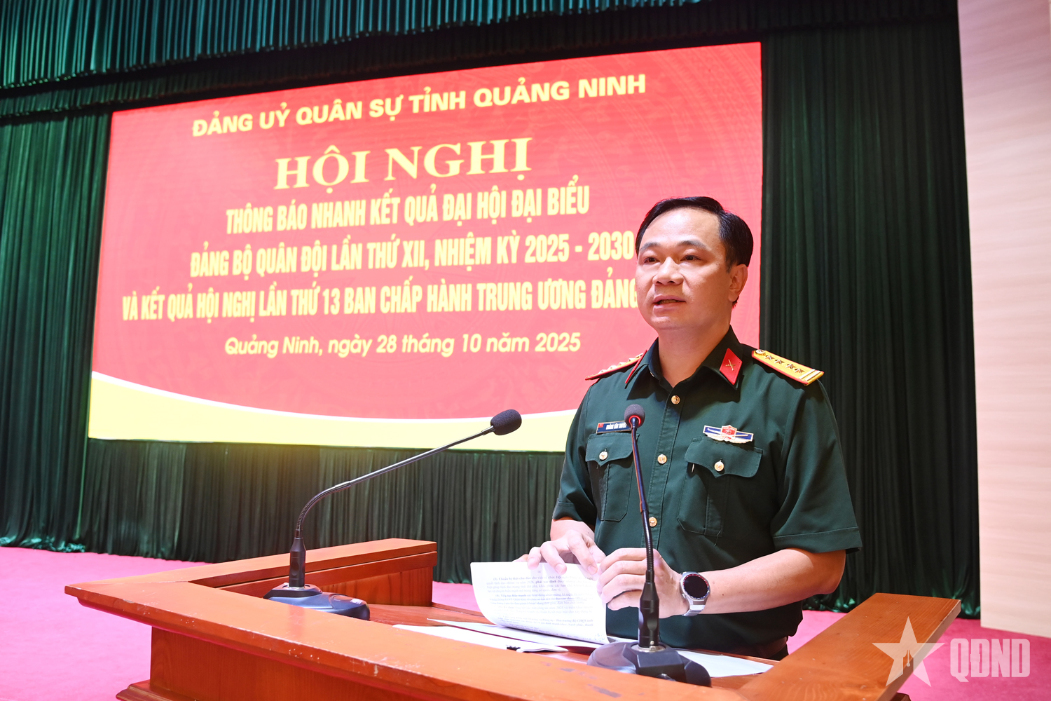 Đại tá Hoàng Văn Thuyết, Tỉnh ủy viên, Phó bí thư Thường trực Đảng ủy, Chính ủy Bộ CHQS tỉnh Quảng Ninh, thông báo nhanh kết quả Đại hội đại biểu Đảng bộ Quân đội lần thứ XII, nhiệm kỳ 2025-2030 và Hội nghị lần thứ 13 Ban Chấp hành Trung ương Đảng khóa XIII.