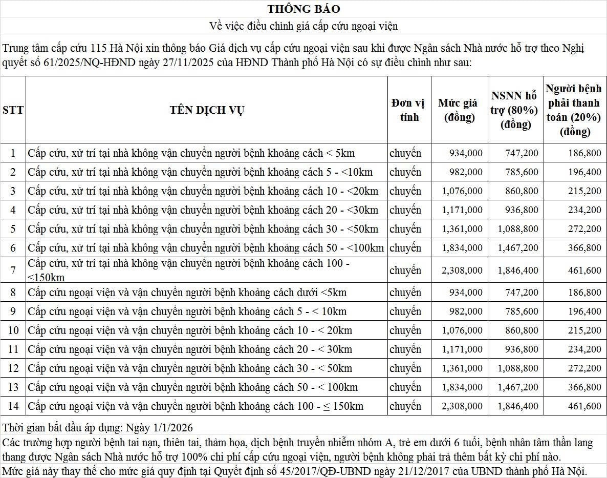 Thông báo về việc điều chỉnh giá cấp cứu ngoại viện