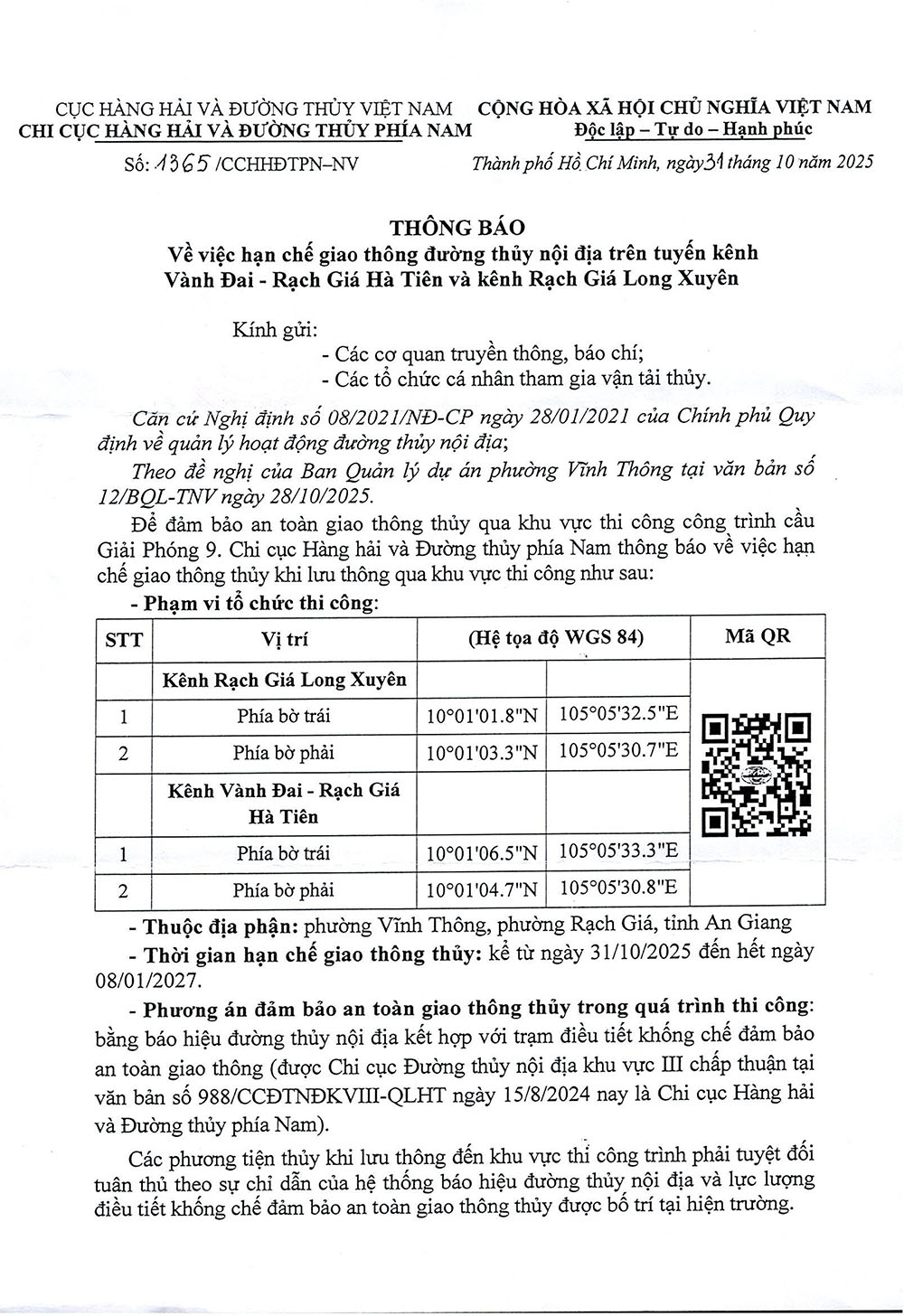 Thông báo về việc hạn chế giao thông đường thủy nội địa trên tuyến kênh Vành Đai - Rạch Giá Hà Tiên và kênh Rạch Giá Long Xuyên
