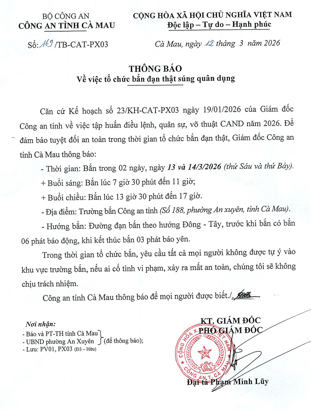 THÔNG BÁO - Về việc tổ chức bắn đạn thật súng quân dụng