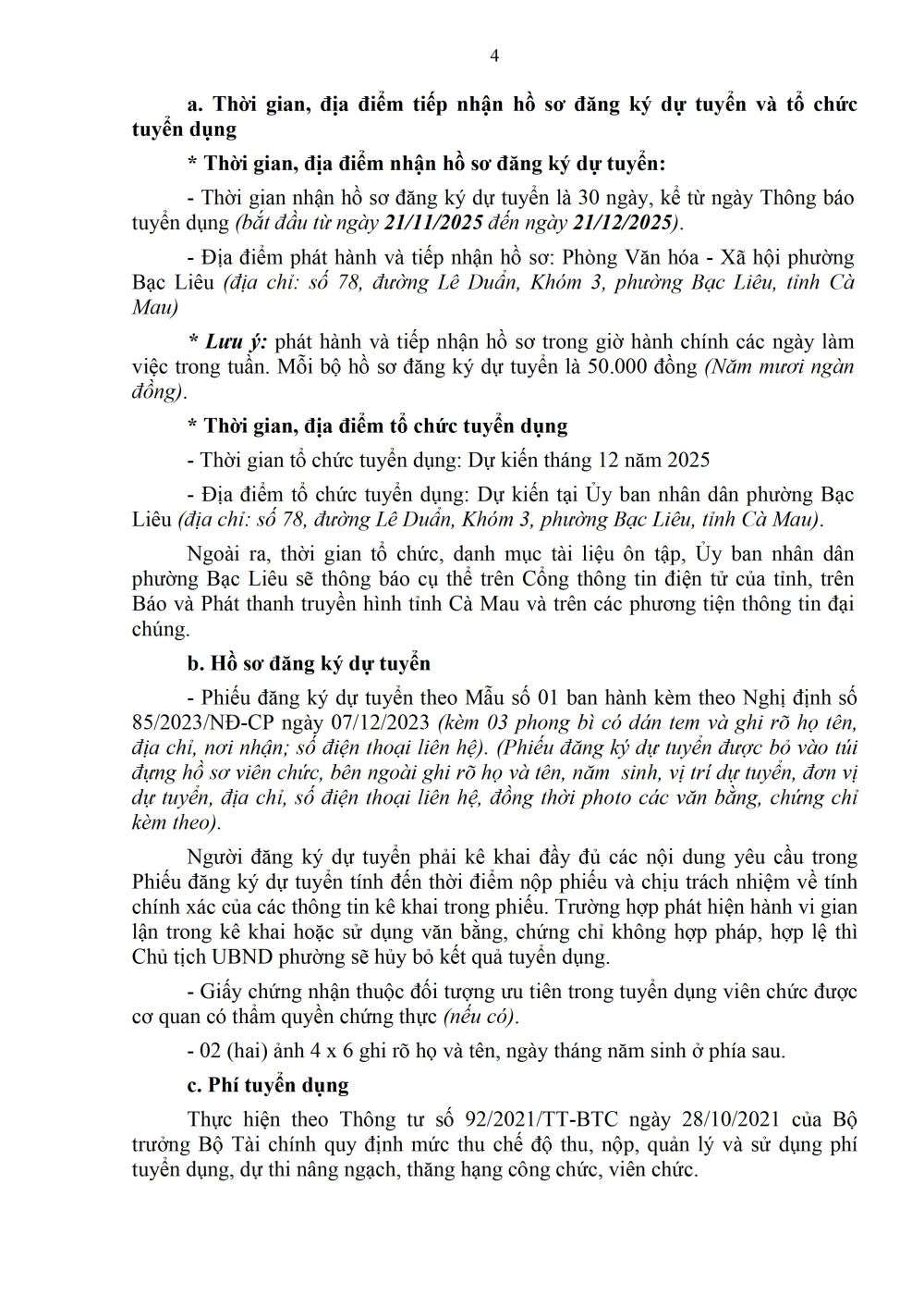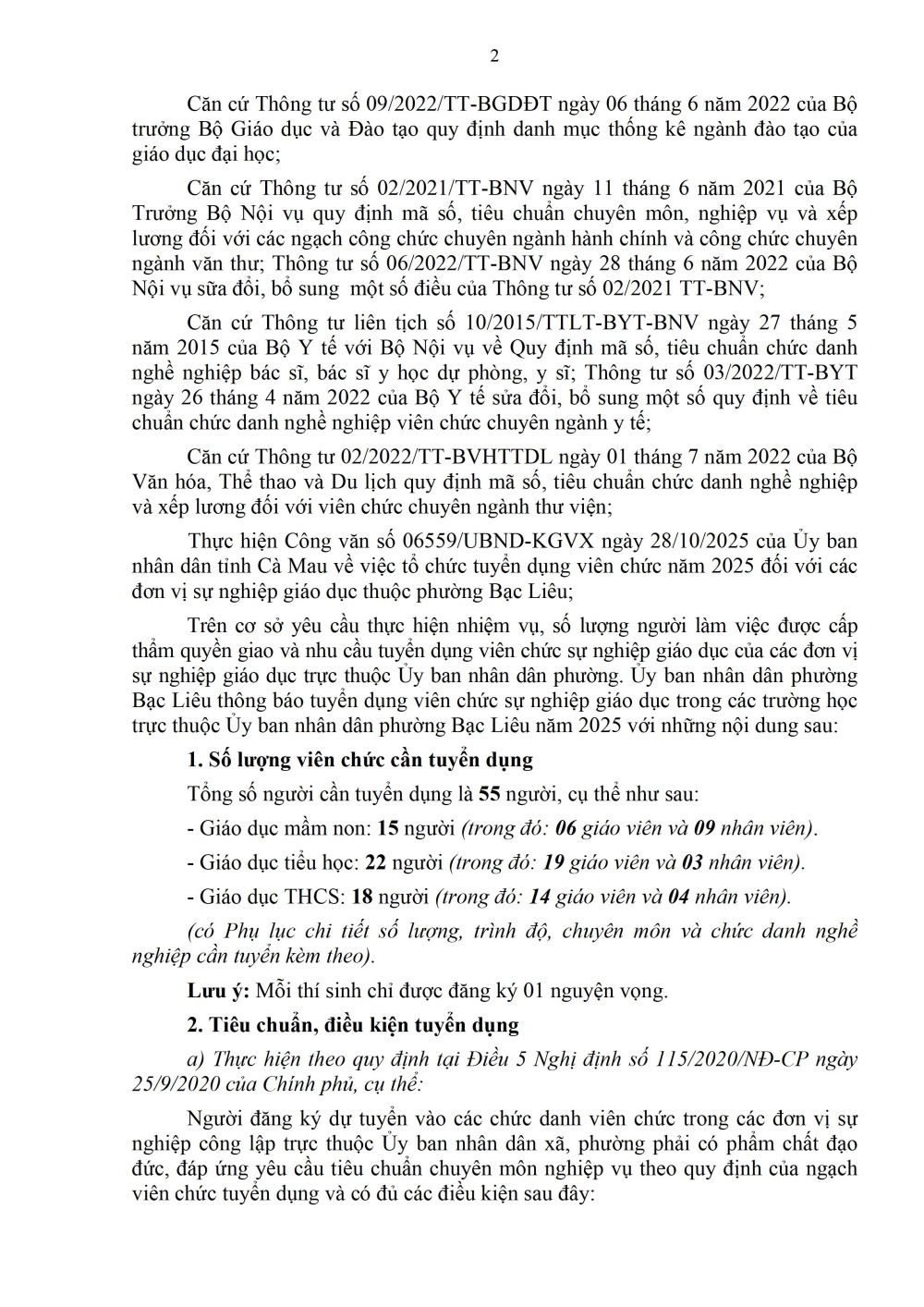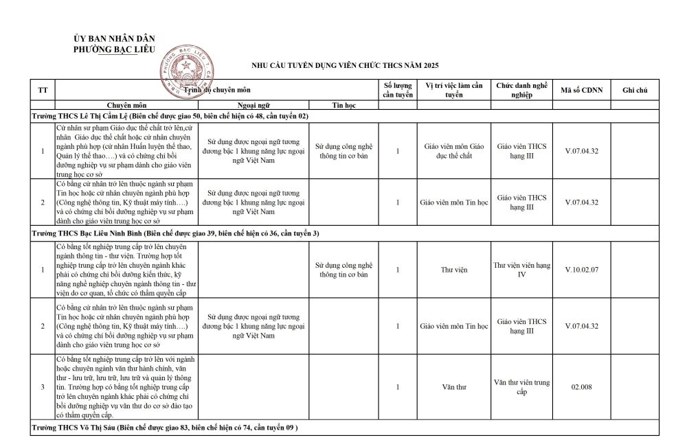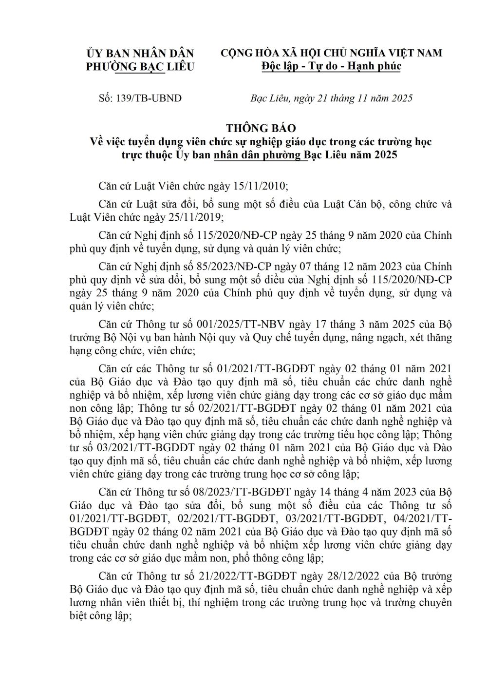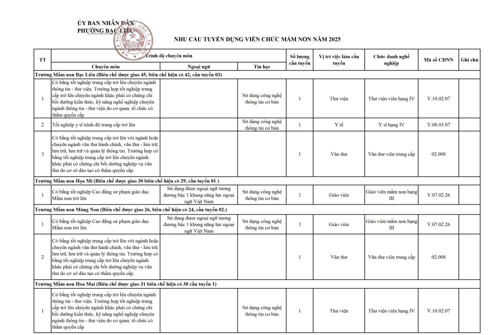 Thông báo về việc tuyển dụng viên chức sự nghiệp giáo dục trong các trường học trực thuộc Ủy ban nhân dân phường Bạc Liêu năm 2025