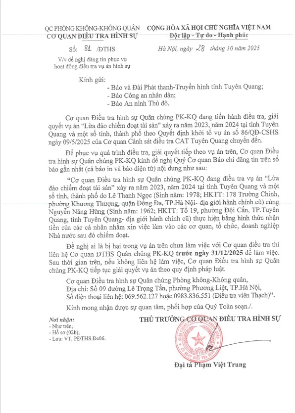 Cơ quan Điều tra hình sự Quân chủng Phòng không – Không quân đề nghị những người bị hại trong vụ án trên chưa làm việc với cơ quan điều tra liên hệ trước ngày 31/12/2025 để phối hợp giải quyết. Sau thời hạn này, vụ án sẽ được xử lý theo quy định pháp luật.