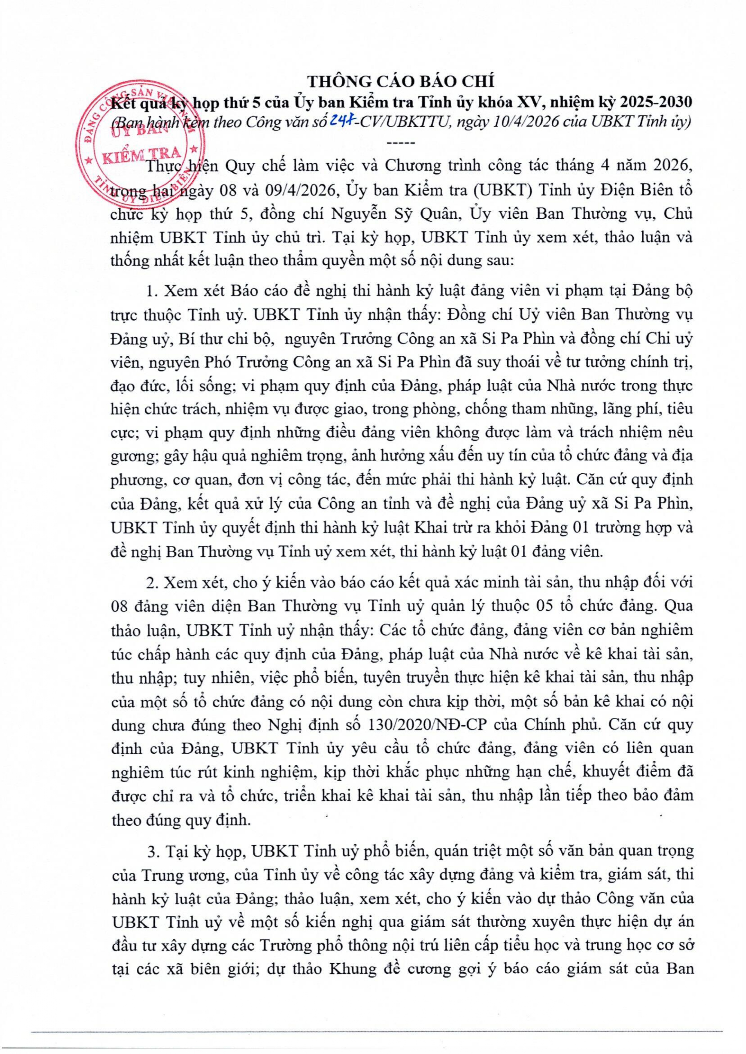 Thông cáo báo chí kỳ họp thứ 5 của Ủy ban Kiểm tra Tỉnh ủy khóa XV, nhiệm kỳ 2025-2030