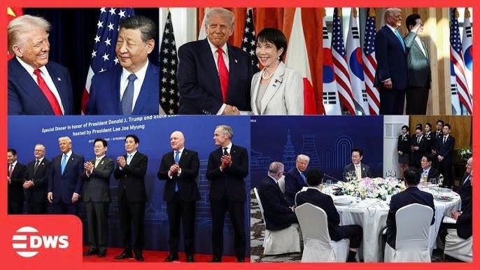 Tại chặng dừng chân ở Busan, Tổng thống Trump khẳng định Washington “gắn bó chặt chẽ” với Hàn Quốc, giải tỏa một số lo ngại về cam kết đầu tư 350 tỷ USD và chấp thuận yêu cầu cho phép Seoul phát triển tàu ngầm hạt nhân. Ông nói với tân Thủ tướng Nhật Bản Sanae Takaichi rằng bà có thể nhờ ông “bất cứ điều gì”. Trong cuộc gặp với Chủ tịch Trung Quốc Tập Cận Bình, ông Trump khẳng định người đồng nhiệm Trung Quốc là “nhà lãnh đạo vĩ đại” và khẳng định hai quốc gia đang chuẩn bị ký kết một thỏa thuận thương mại toàn diện.