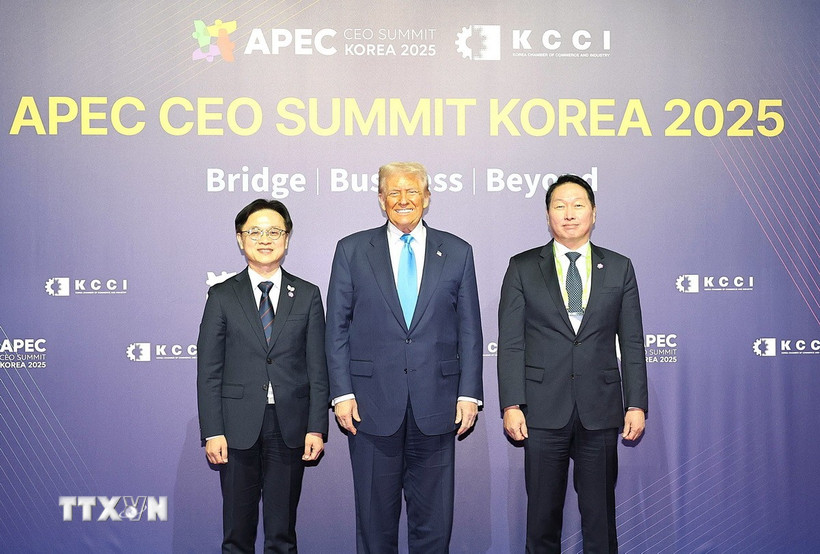Tổng thống Mỹ Donald Trump chụp ảnh chung với ông Chey Tae-won, Chủ tịch Phòng Thương mại và Công nghiệp Hàn Quốc kiêm Chủ tịch Tập đoàn SK, và ông Kim Jung-kwan, Bộ trưởng Thương mại, Công nghiệp và Năng lượng. Hàn Quốc. (Ảnh: Khánh Vân/TTXVN)