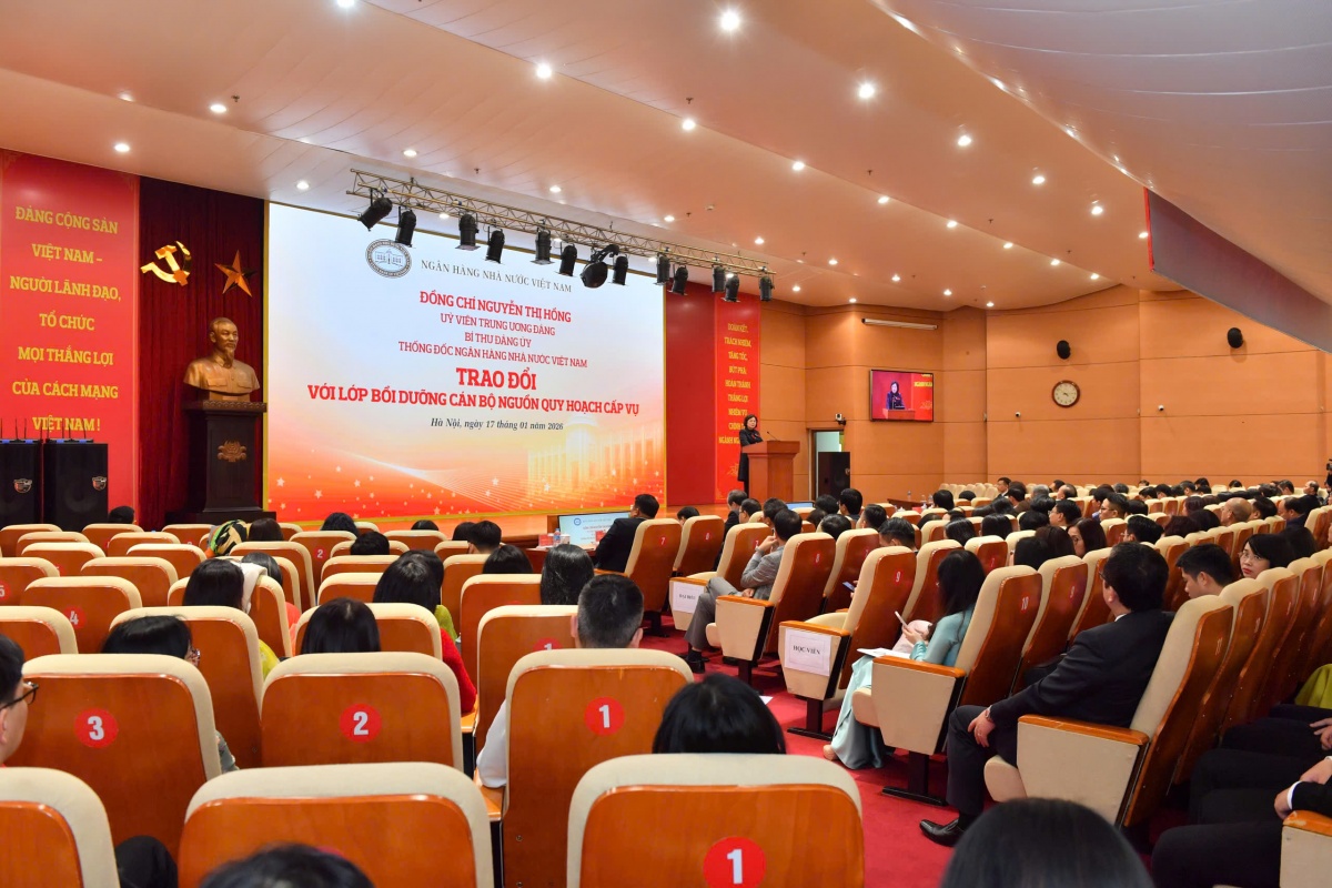 Cùng dự buổi trao đổi có đồng chí Phạm Tiến Dũng, Ủy viên Ban Thường vụ Đảng ủy, Phó Thống đốc NHNN; đồng chí Lê Thị Mai Hương, Phó Bí thư chuyên trách Đảng ủy NHNN. Tại buổi trao đổi cũng có các đồng chí là thủ trưởng, lãnh đạo các Vụ, Cục, đơn vị thuộc NHNN, tổ chức tín dụng, doanh nghiệp, tổ chức tài chính do NHNN quản lý cùng toàn thể các đồng chí học viên của Lớp bồi dưỡng.