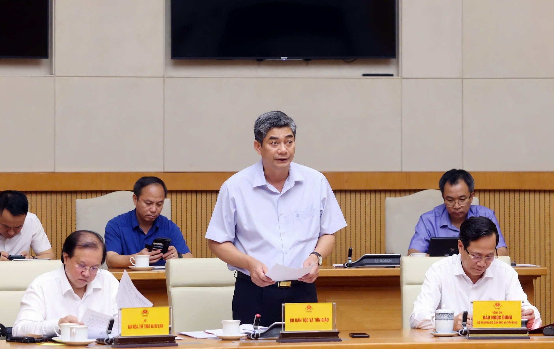 Thứ trưởng Bộ Dân tộc và Tôn giáo Y Vinh Tơr báo cáo tại cuộc họp. Ảnh: VGP/Nguyễn Hoàng