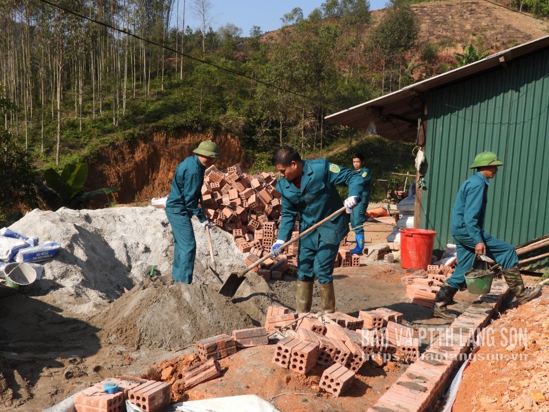 Lực lượng dân quân xã Thống Nhất hỗ trợ gia đình anh Nguyễn Văn Ngọt, thôn Phai Bây xây dựng nhà ở