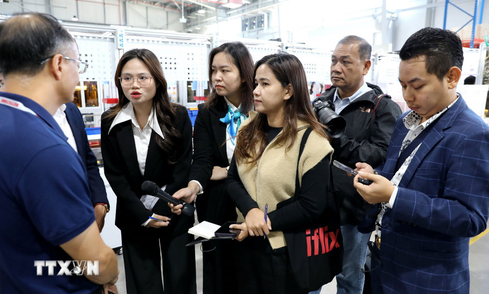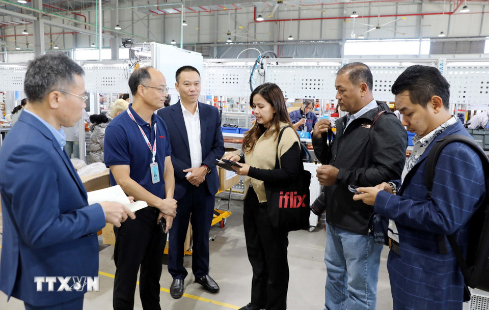 Đoàn phóng viên Thông tấn xã Campuchia (AKP) tìm hiểu hoạt động sản xuất kinh doanh tại Công ty Trách nhiệm hữu hạn Keystone Electrical Việt Nam thuộc Khu Công nghiệp Liên Hà Thái (Khu Kinh tế Thái Bình) ở xã Thái Thụy, tỉnh Hưng Yên. (Ảnh: Thế Duyệt/TTXVN)