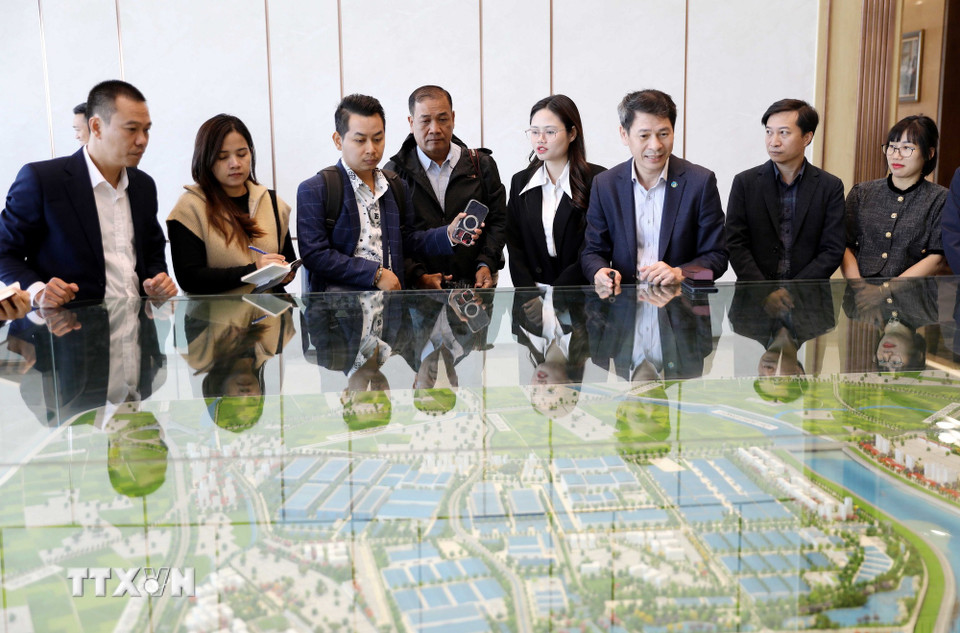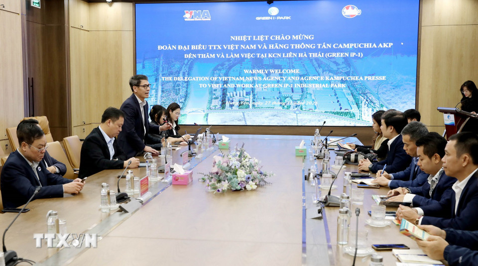 Đoàn phóng viên Thông tấn xã Campuchia (AKP) làm việc với Công ty cổ phần Green i-Park, đơn vị đầu tư hạ tầng Khu Công nghiệp Liên Hà Thái thuộc Khu Kinh tế Thái Bình (xã Thái Thụy, tỉnh Hưng Yên). (Ảnh: Thế Duyệt/TTXVN)