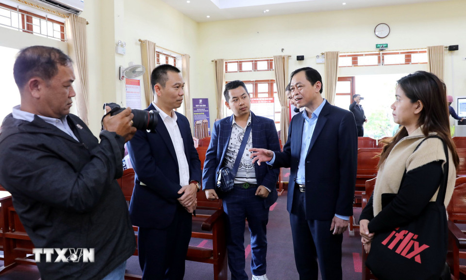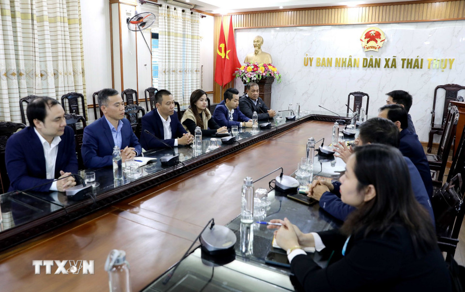 Đoàn phóng viên Thông tấn xã Campuchia (AKP) tìm hiểu việc ứng dụng công nghệ số vào quản lý điều hành chính quyền địa phương 2 cấp tại xã Thái Thụy, tỉnh Hưng Yên. (Ảnh: Thế Duyệt/TTXVN)