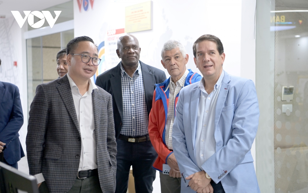 Phó Tổng Giám đốc VOV Phạm Mạnh Hùng cùng đoàn Prensa Latina tham quan một đơn vị sản xuất chương trình của VOV.