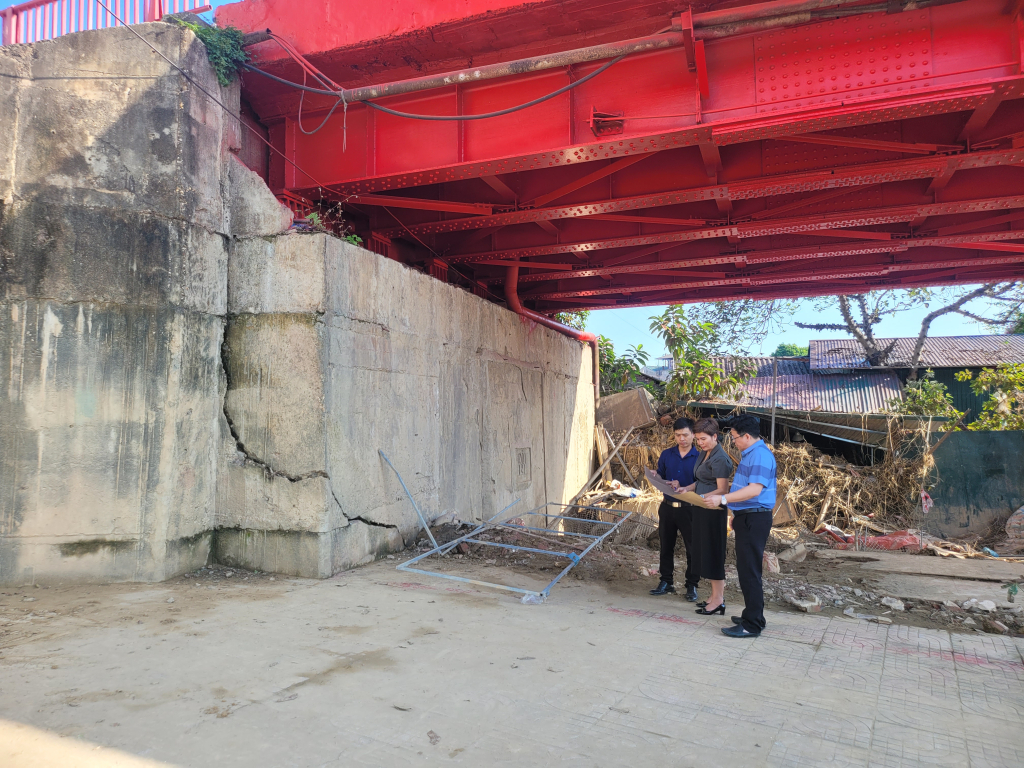 Đoàn công tác Sở Xây dựng tỉnh khảo sát tại khu vực xuất hiện vết nứt chân cầu Bằng Giang, phường Nùng Trí Cao