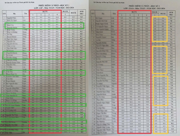 Cụ thể: Phiếu điểm cá nhân học kỳ 1 môn Toán năm học 2023 - 2024 của một số lớp khối 11, 12, do giáo viên Võ Trung Thành và Phạm Minh Trí dạy môn Toán để điểm thường xuyên phổ biến 8, 9, 10, nhưng khi kiểm tra tập trung chỉ 3, 4, 5 điểm. Chẳng hạn, học sinh B.N.A. (lớp 12A14), điểm kiểm tra thường xuyên 4 lần là 8.0, 9.0, 8.0, 9.0 điểm, nhưng điểm kiểm tra giữa kỳ chỉ được 2.2 điểm và điểm kiểm tra cuối kỳ là 3.0 điểm; học sinh V.M.N. (lớp 12A14), điểm kiểm tra thường xuyên là 8.0, 10, 8.0, 9.0, nhưng điểm kiểm tra giữa kỳ chỉ được 3.0 điểm và điểm kiểm tra cuối kỳ là 4.8 điểm.