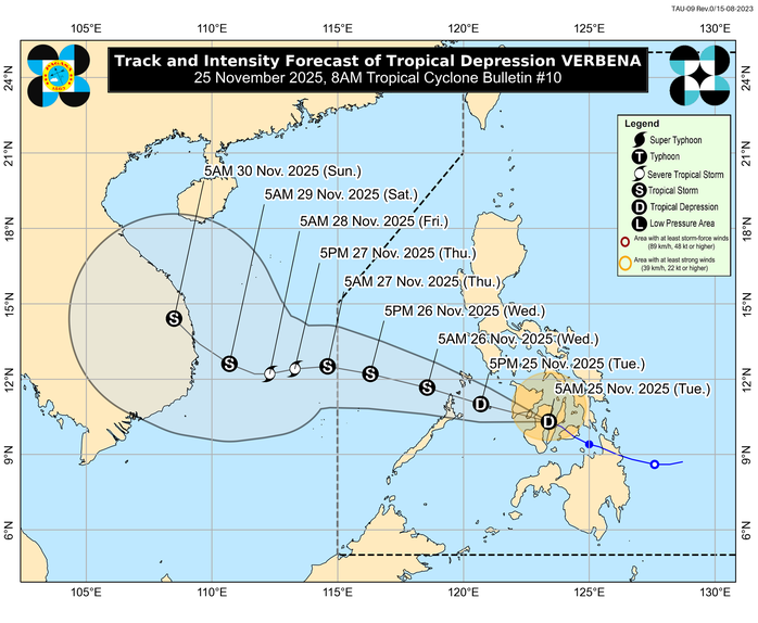 Theo bản tin sáng 25-11 của Cục Quản lý thiên văn, địa vật lý và khí quyển Philippines (PAGASA), áp thấp nhiệt đới Verbena đang di chuyển ngang vùng Trung Visayas của nước này. Đây chính là áp thấp nhiệt đới được dự báo sẽ trở thành cơn bão số 15 tấn công Việt Nam.