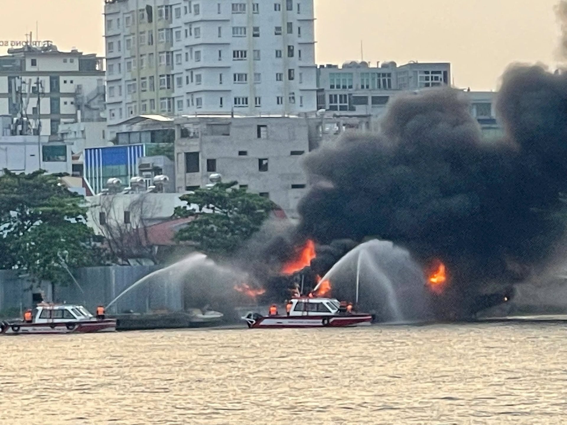 Sau hơn 30 phút, ngọn lửa vẫn bùng phát mạnh, thiêu rụi nhiều tài sản trên tàu.