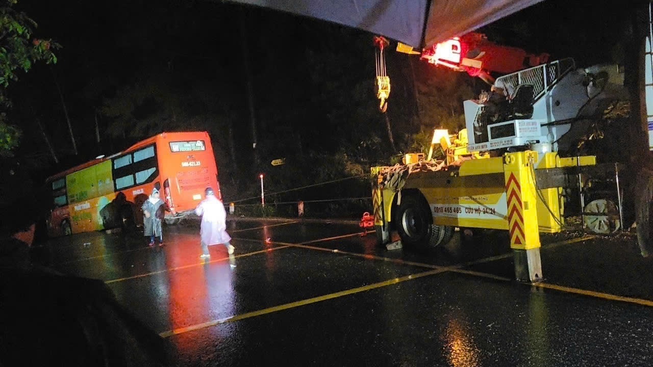 Một chiếc xe khách suýt rơi xuống hố sụt do sạt lở trên đèo. Ảnh: Báo và Phát thanh, Truyền hình Lâm Đồng.