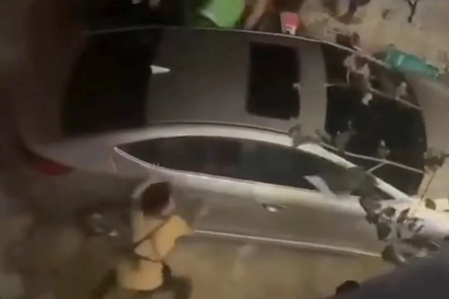 Chiếc xe lao vào đám đông và bị ném vật dụng vào xe. Ảnh cắt từ video clip.