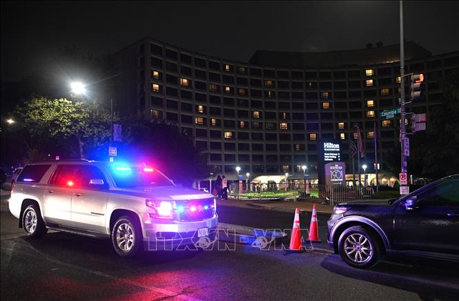 Xe cảnh sát đỗ phía trước khách sạn Washington Hilton ở Washington, D.C., nơi tổ chức buổi dạ tiệc báo chí tối 25/4/2026. Ảnh: THX/TTXVN