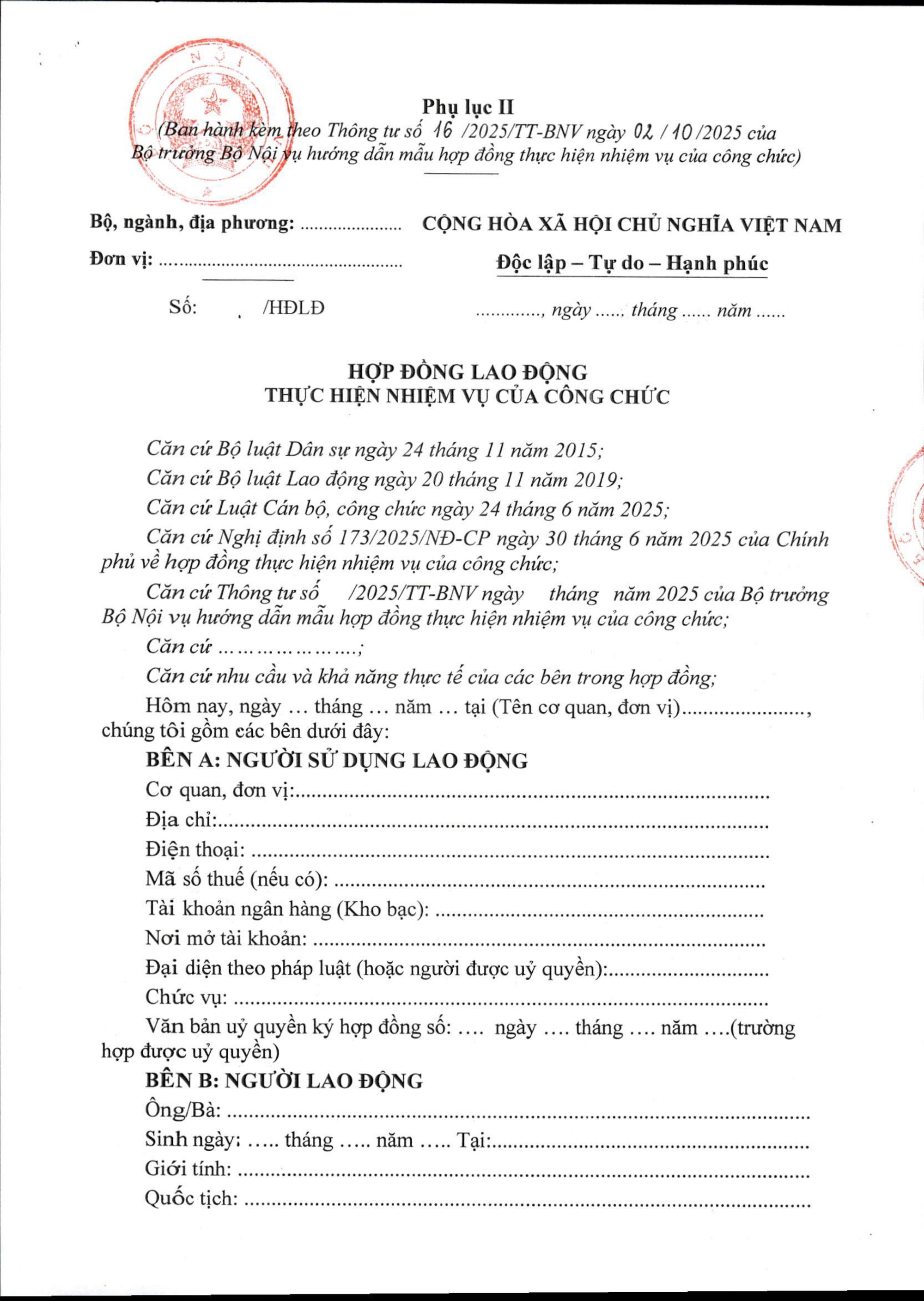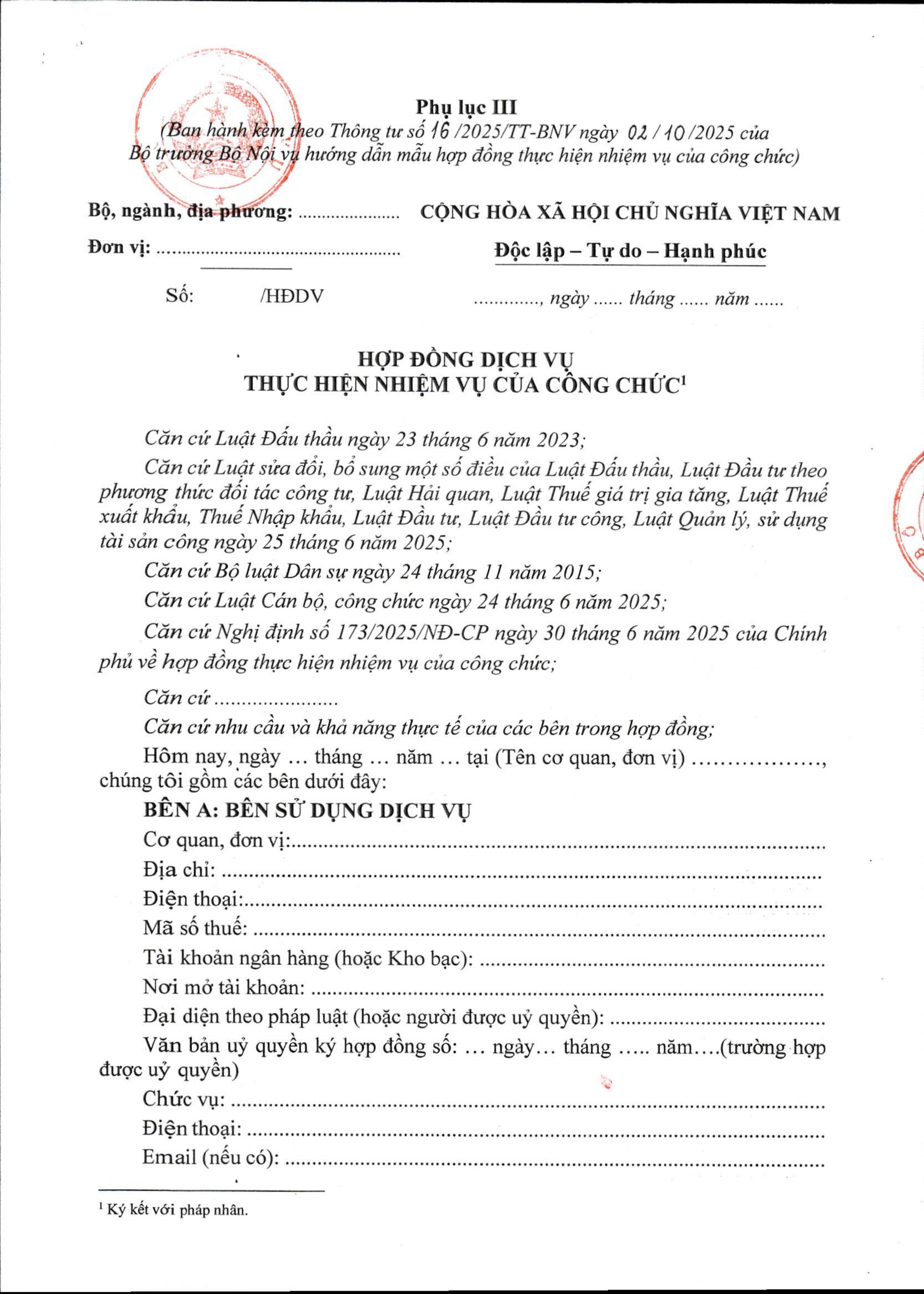 Thông tư số 16/2025/TT-BNV hướng dẫn hợp đồng thực hiện nhiệm vụ công chức