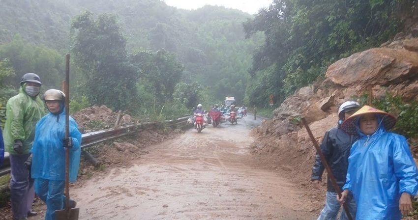 Theo Công ty cổ phần Quản lý và Xây dựng Đường bộ Thừa Thiên Huế, mưa lớn thời gian qua đã làm khối lượng đất đá lớn sạt trượt từ trên đồi tràn ra mặt đường Hồ Chí Minh tại vị trí Km 317+150 thuộc tuyến đèo Pê Ke, gây ách tắc giao thông.