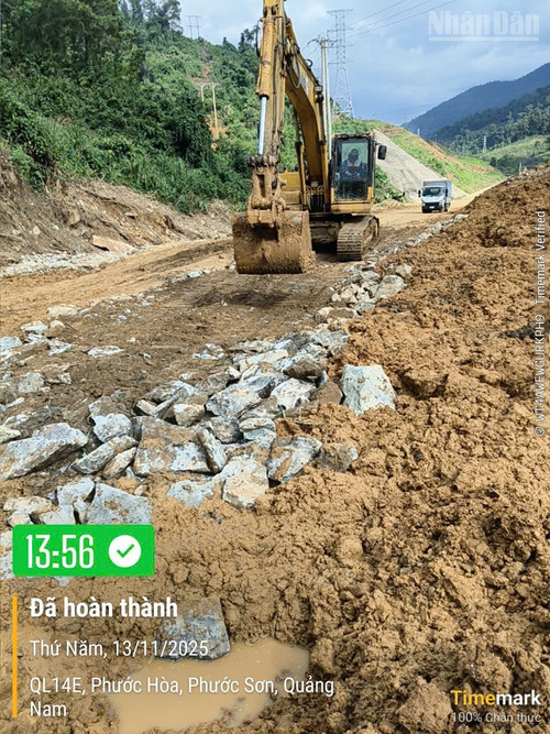 Tới 15h ngày 13/11, Quốc lộ 14E chính thức lưu thông được ô-tô lẫn xe máy sau 2 tuần bị đứt đoạn do sạt lở ta-luy vì mưa bão.