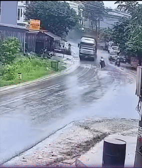 Theo đoạn clip ghi lại, người đàn ông đi xe đạp mặc áo mưa và thản nhiên băng qua đường mà không có sự quan sát trước sau. Cùng lúc, tài xế container cũng đang đi cùng chiều lao đến. Do người đàn ông đi xe đạp qua đường bất ngờ, tài xế container phải vội đánh lái vào lề đường.