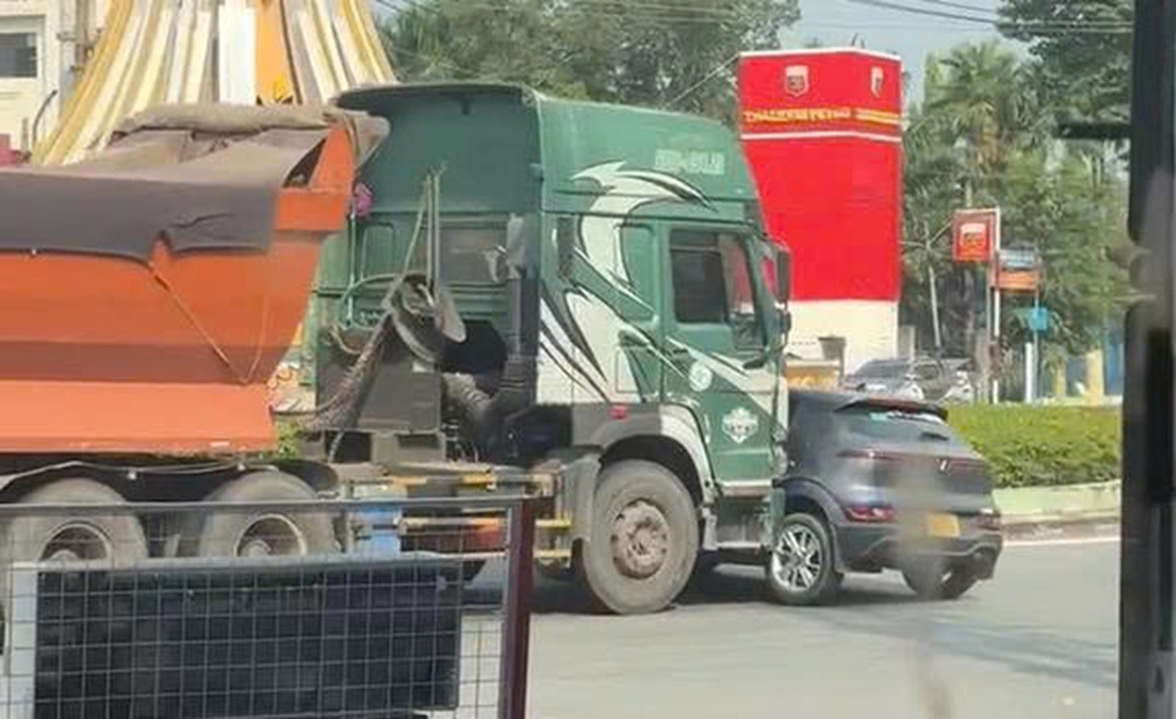 Ô tô điện bị xe đầu kéo ủi gần 10m tại vòng xoay. Ảnh cắt từ clip