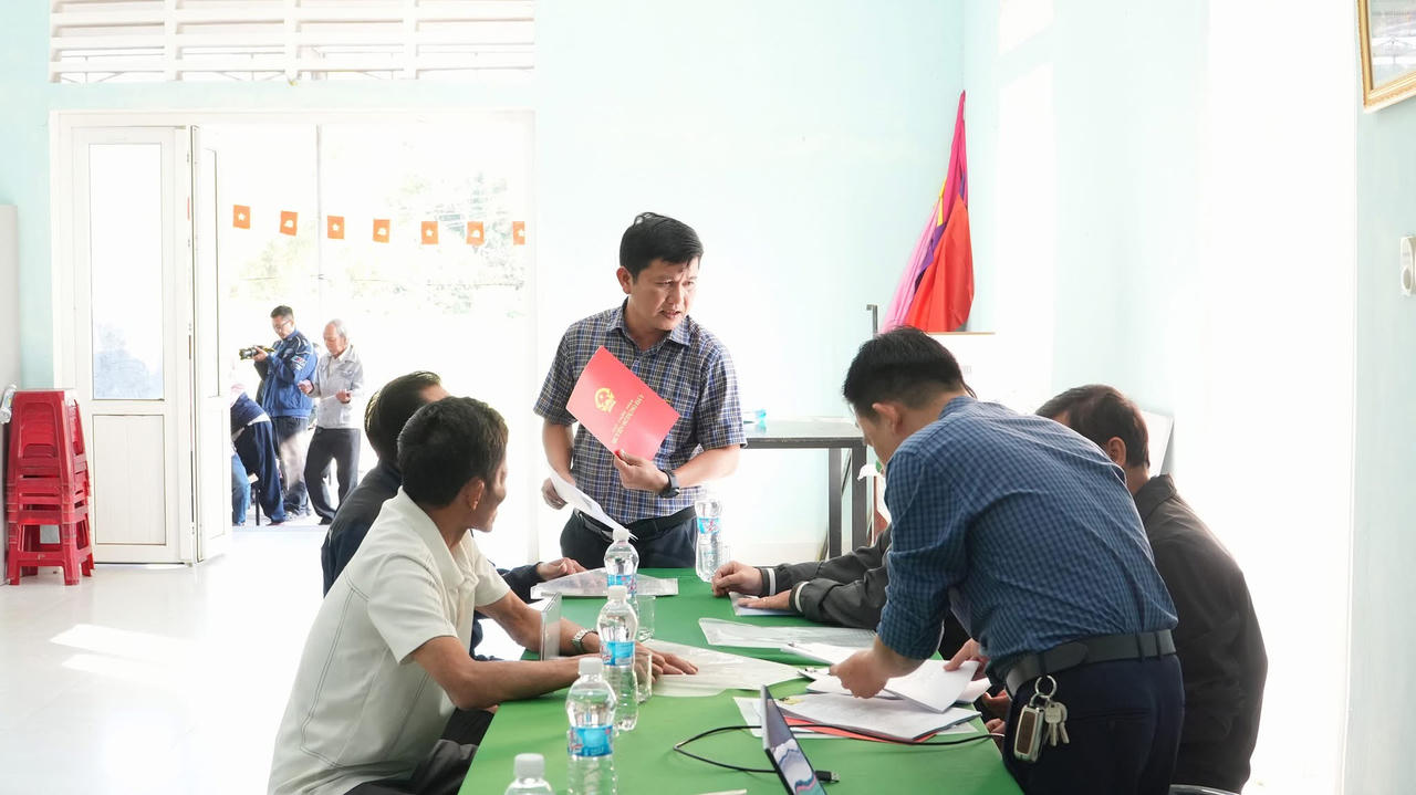 Tại Nhà văn hóa thôn 9, chị Nguyễn Thị Hà (người dân địa phương) cho biết, gia đình chị khai hoang mảnh đất từ nhiều năm trước nhưng do điều kiện khó khăn, không có thời gian đi lại trong giờ hành chính nên việc làm thủ tục cấp Giấy chứng nhận quyền sử dụng đất bị chậm. “Nay xã tổ chức làm việc ngay tại thôn vào ngày thứ Bảy, cán bộ hướng dẫn cụ thể, rõ ràng từng giấy tờ, giúp người dân đỡ vất vả, rất thuận lợi,” chị Hà chia sẻ.