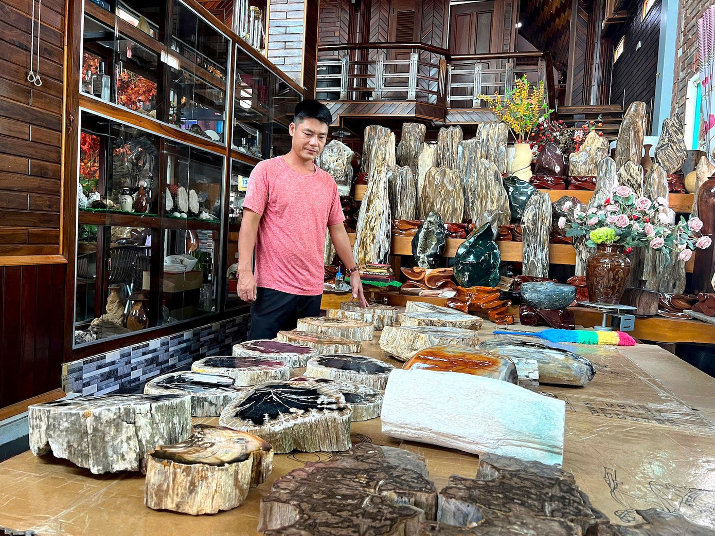 Các sản phẩm gỗ hóa đá được anh Thành trưng bày tại quán cà phê