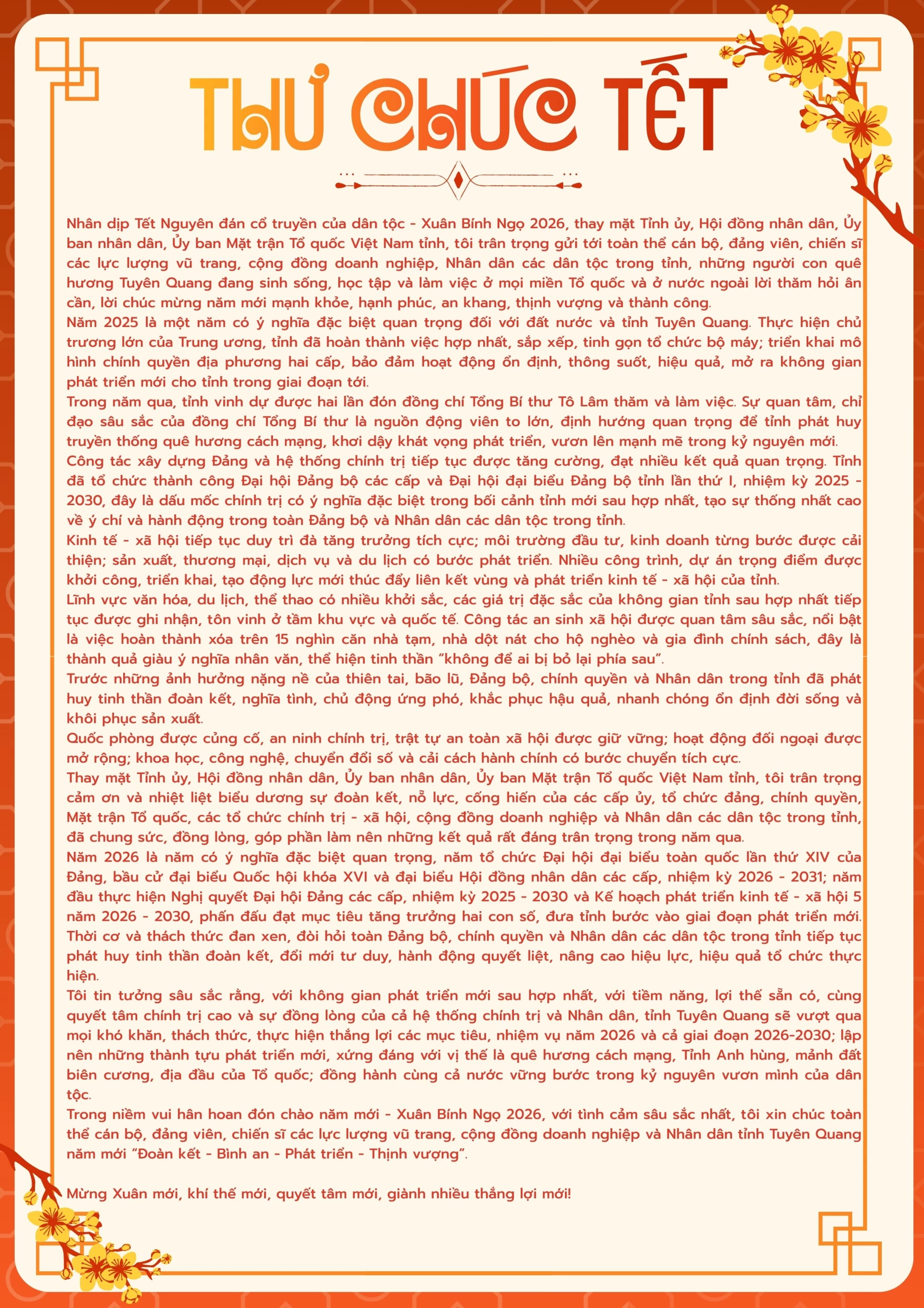 Nguồn Tuyên Quang : http://baotuyenquang.com.vn/thoi-su-chinh-tri/tin-tuc/202602/thu-chuc-tet-cua-dong-chi-hau-a-lenh-uy-vien-ban-chap-hanh-trung-uong-dang-bi-thu-tinh-uy-nhan-dip-xuan-binh-ngo-2026-c693a00/