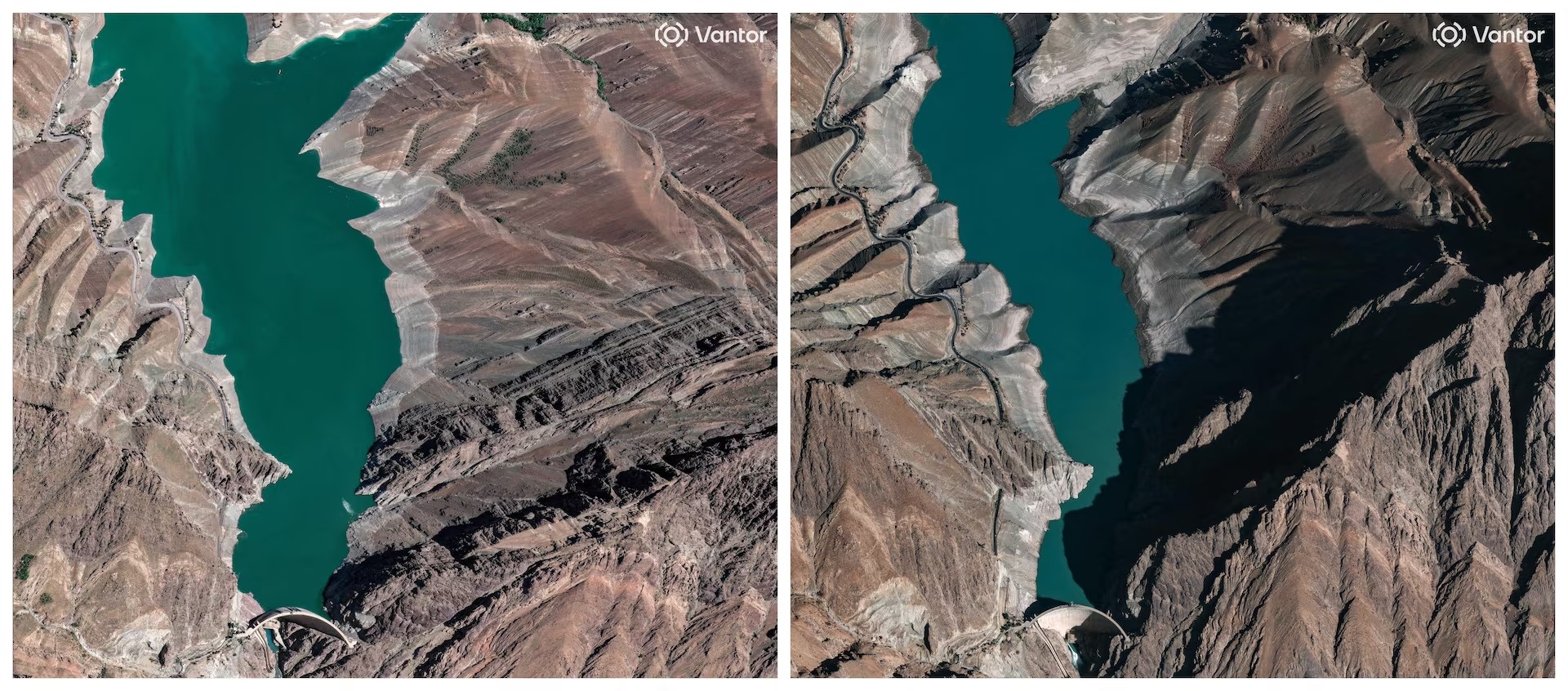 Mực nước của đập Amir Kabir gần Karaj hồi tháng 5 và tháng 11. Ảnh: Vantor.