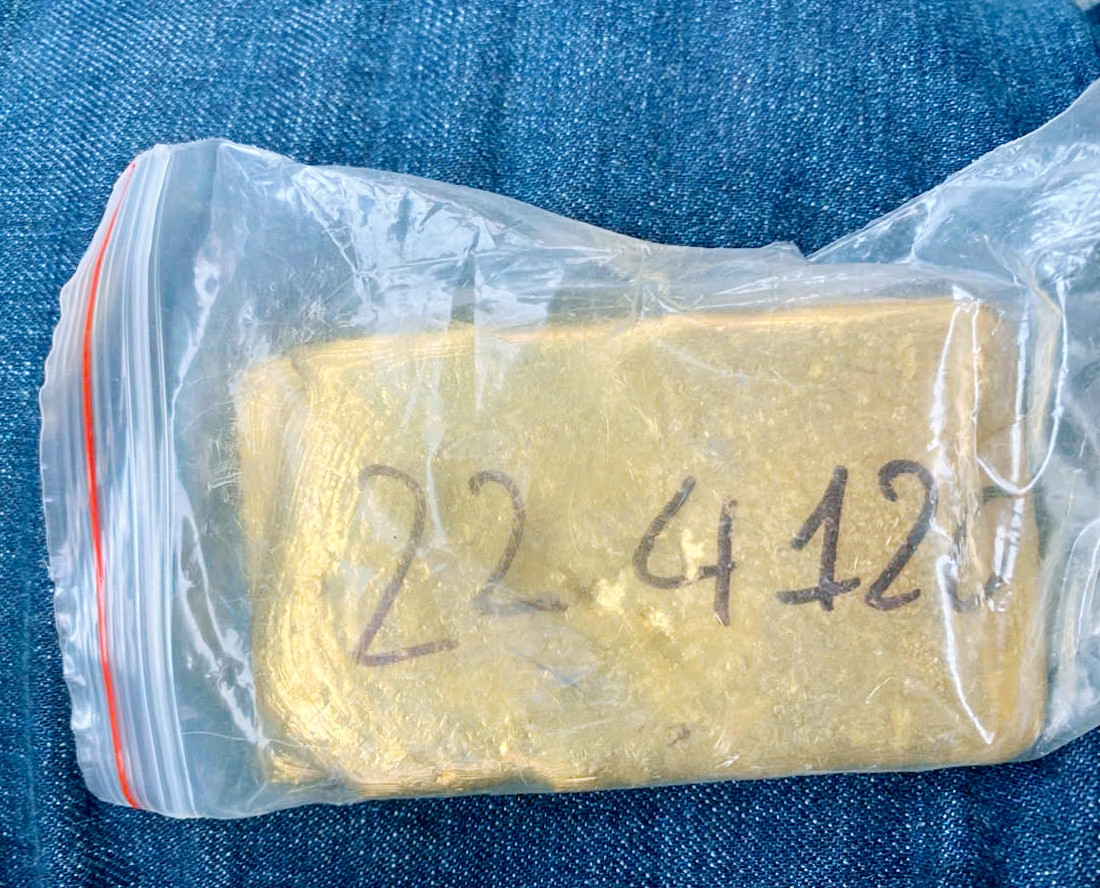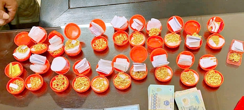 Khám xét khẩn cấp, công an thu giữ 4 miếng vàng thô chưa chế tác, 22 sợi dây chuyền vàng, tổng trọng lượng 65 cây vàng, trị giá gần 9 tỷ đồng, và nhiều thiết bị máy móc để chế tác vàng giả.